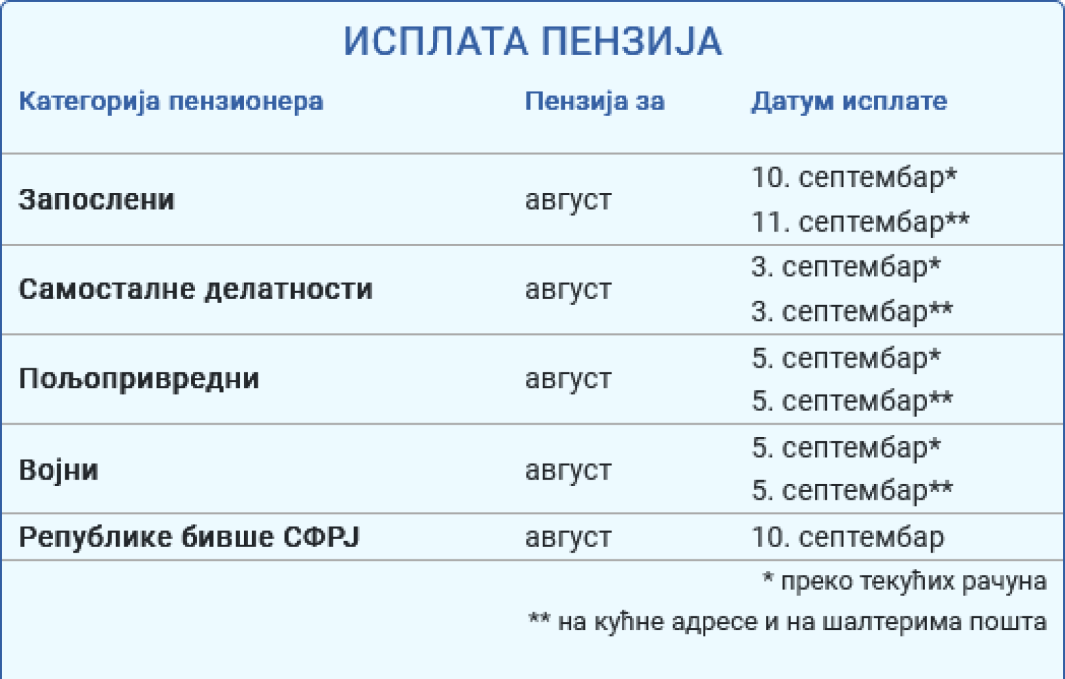 Poslednji će penzije primiti korisnici iz kategorije zaposlenih, pošto će 10. septembra početi isplata za korisnike koji su se opredelili da penzije primaju preko tekućih računa, a 11. septembra za one koji penzije dobijaju na kućnim adresama ili poštanskim šalterima.