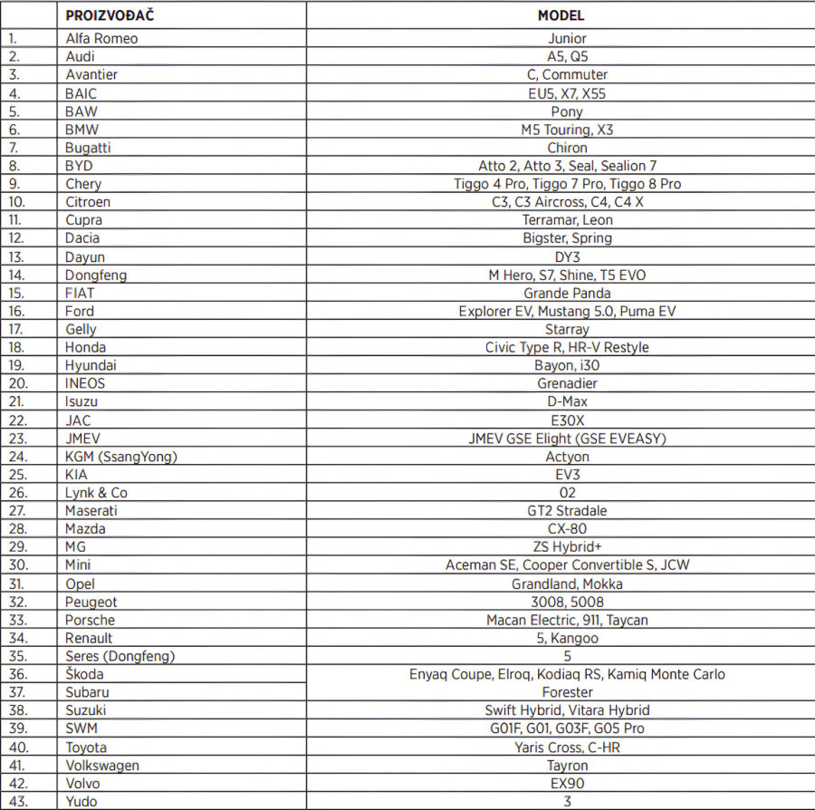 Imaćemo prilike da vidimo i Fiat Grande Pandu, Volkswagen Tayron kao i Volvo EX90, a sve modele koji će biti premijerno prikazani na Sajmu automobila u Beogradu možete videti u sledećoj tabeli.