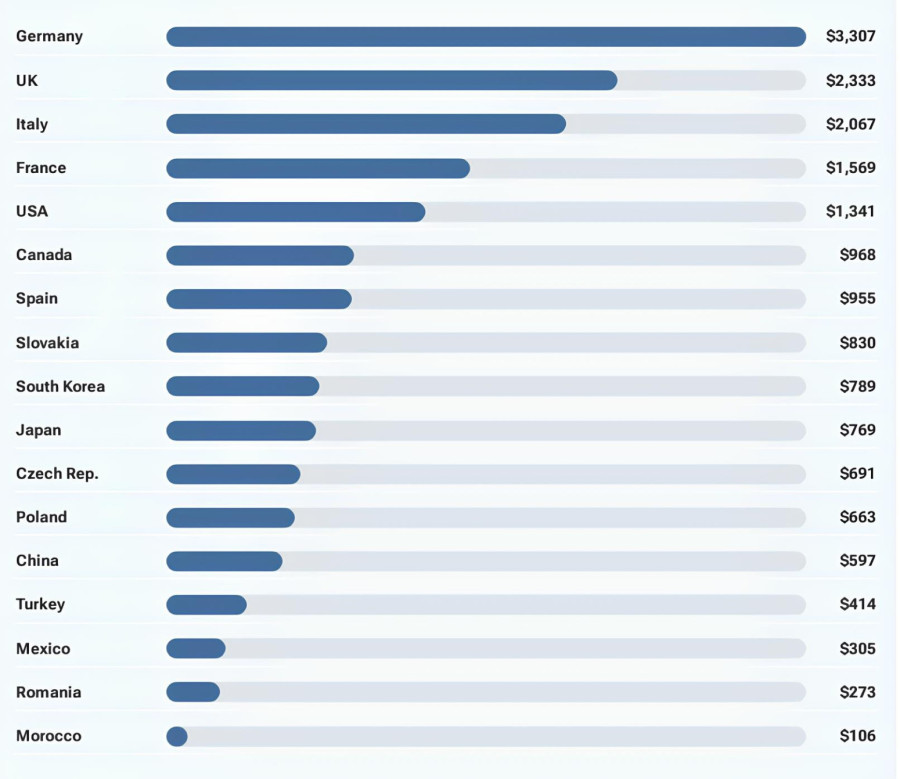 Istraživači su analizirali 250 fabrika širom sveta i otkrili da je Nemačka najskuplja zemlja za proizvodnju automobila – prosečni trošak rada po vozilu iznosi oko 3.300 dolara (uključujući plate, penzijsko i druge beneficije).