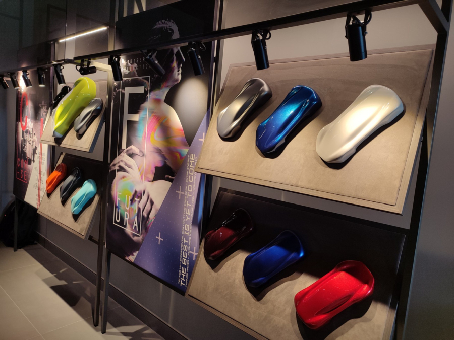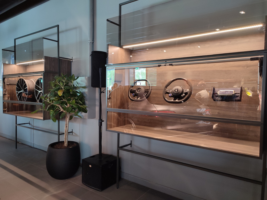 U salonu su izloženi najnoviji prestižni modeli ovog brenda, a prostor je koncipiran tako da su automobili posebno osvetljeni i izloženi poput skulptura u umetničkoj galeriji.