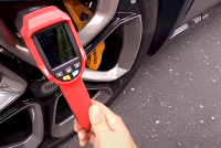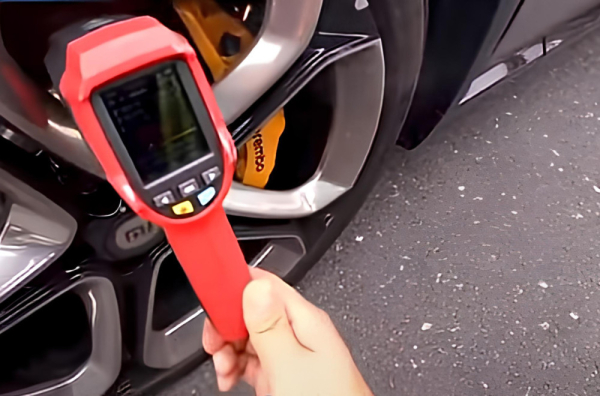 Na snimku se vidi kako tehničari mirno posmatraju situaciju dok merač pokazuje 619 stepeni Celzijusa na kočnicama, svega pedesetak stepeni manje od tačke topljenja aluminijuma.