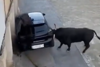 Jedan bik tako se "nameračio" na parkirani Peugeot 208, kao što se jasno vidi sa snimka objavljenog na društvenoj mreži Reddit.