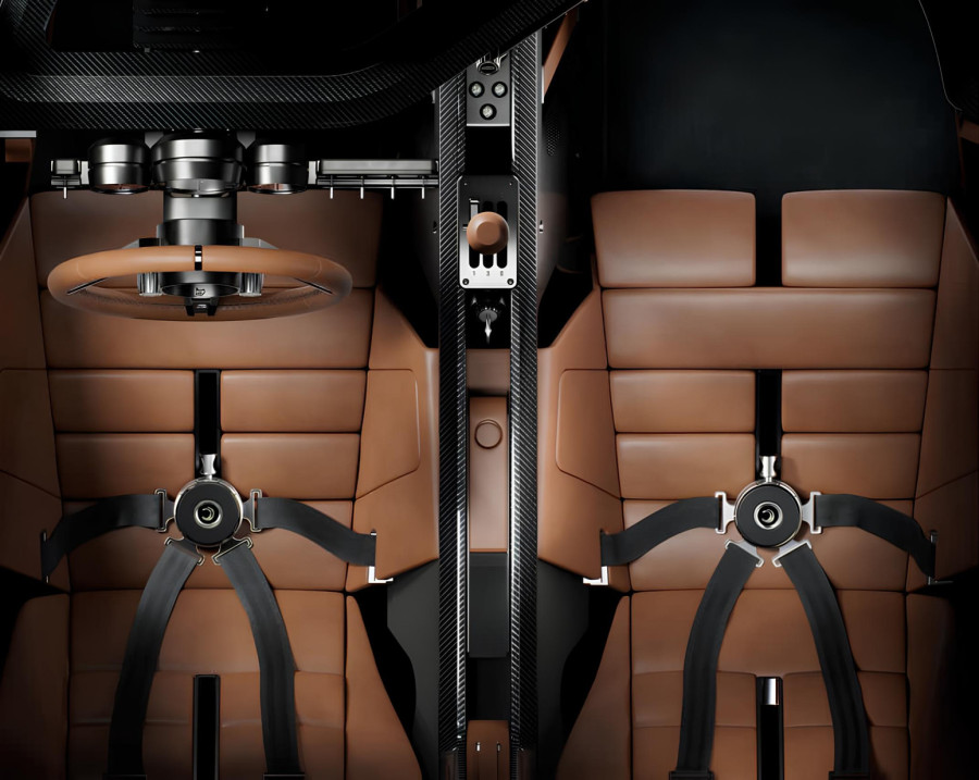 Unutrašnjost je potpuno "analogna": tri klasična instrumenta, volan sa samo dva dugmeta (start/stop i izbor režima vožnje), a tu su i fiksna sedišta sa prilagodljivim "pedal boxom", menjačem i volanom.