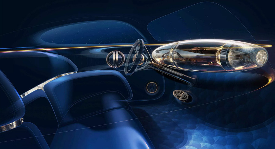 Unutra se art-deco uticaj se nastavlja sa lebdećom staklenom strukturom na komandnoj tabli, koju Mercedes naziva "Zeppelin", elegantnim četvorokrakim volanom i AI saputnikom.