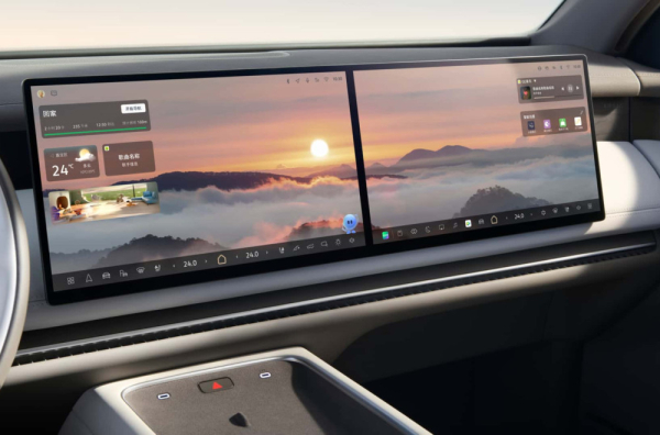 Centralni deo komandne table čini dvostruki ekran od po 15,6 inča, dok se iz plafona spušta dodatni 21,4-inčni ekran za putnike pozadi.