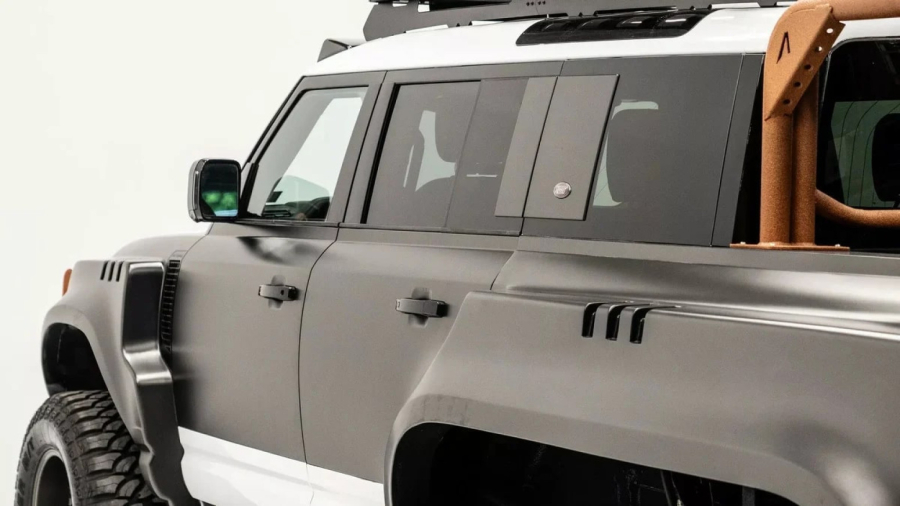 Načinjene su i brojne promene karoserije, tako da Defender sada ima široke blatobrane, bočne stepenice i pragove, kao i narandžasti prednji branik.