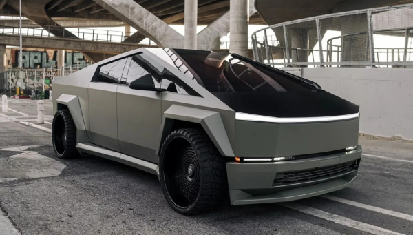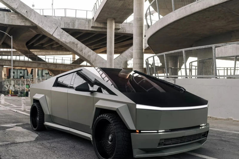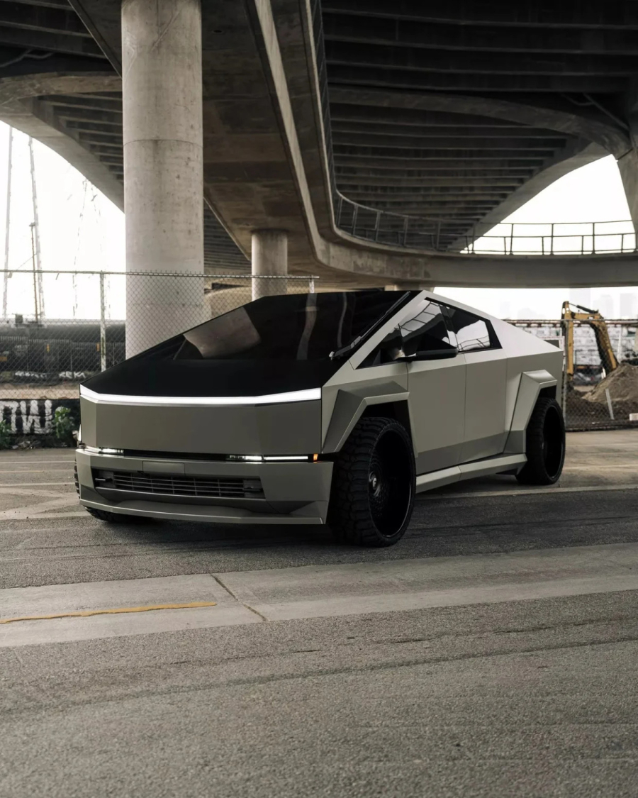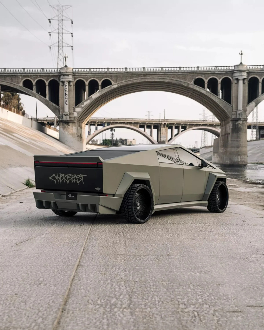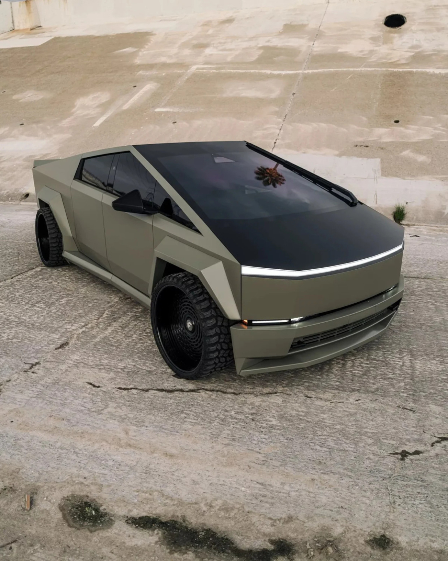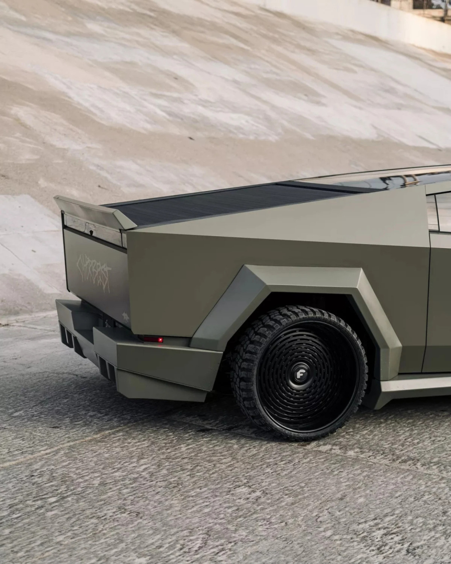 Cybertruck na fotografijama preko svoje karoserije od nerđajućeg čelika ima specijalnu zelenu foliju, dok boja komponenti body kita odgovara istoj nijansi. Pikap je na ogromnim 25-inčnim crnim felnama kompanije Forgiato, na kojima su off-road gume.