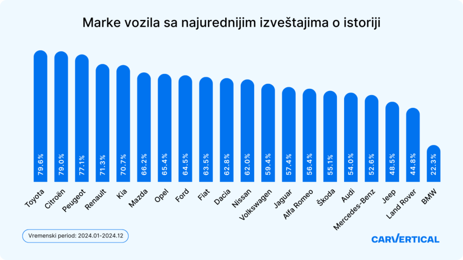 Od svih marki vozila proverenih u Srbiji putem carVerticala, Toyota se ističe – 79,6% automobila ovog proizvođača imalo je čistu istoriju, a slede Citroën (79%) i Peugeot (77,1%).