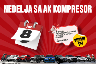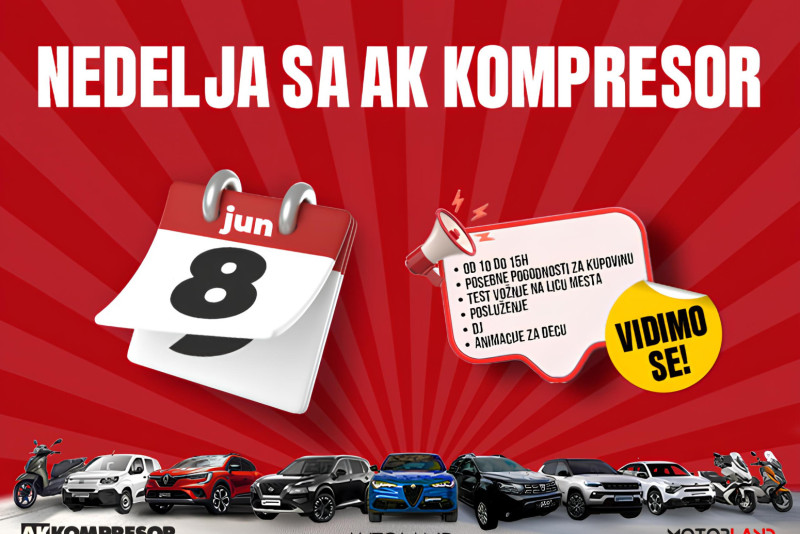 Kompanija "AK Kompresor", koja se već godinama ističe kao lider na tržištu u pružanju visokog kvaliteta usluga i pouzdane kupovine vozila, organizuje poseban događaj za sve ljubitelje automobila i motocikala – "Nedelja sa AK Kompresor", u nedelju, 8. juna 2025. godine, na adresi Žorža Klemansoa 19, Dorćol – parking iza Renault salona.