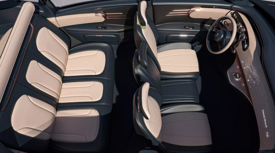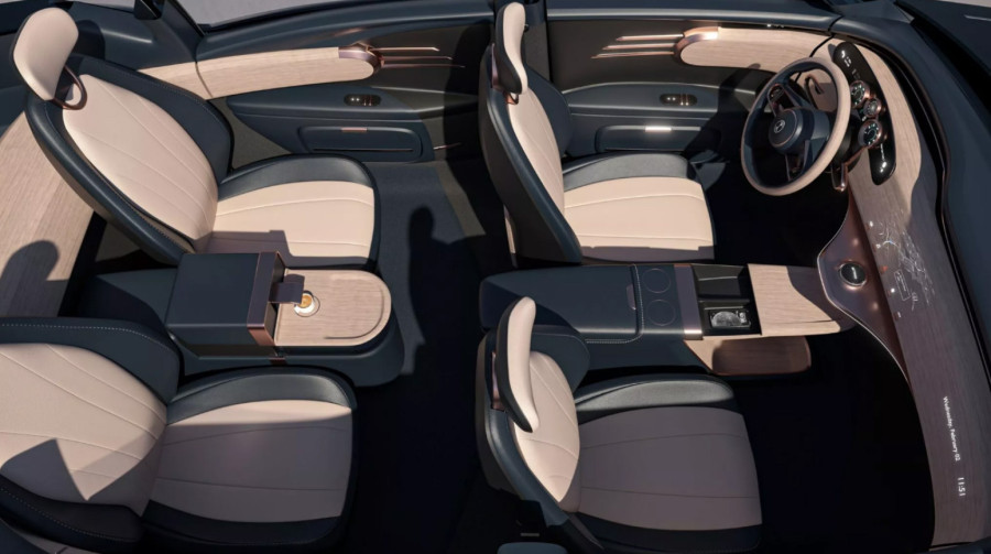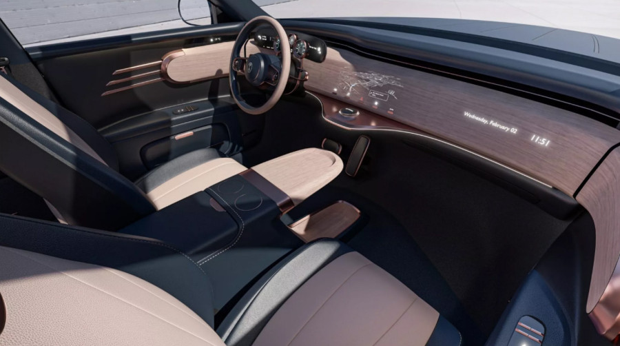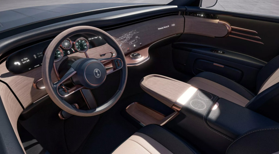 Unutrašnjost je minimalistička i bez plastike – koristi se drvo, tkana vuna i netoksične bio-kože. Ekrani su skriveni iza poluprovidnih drvenih panela i projektuju se direktno na površine.