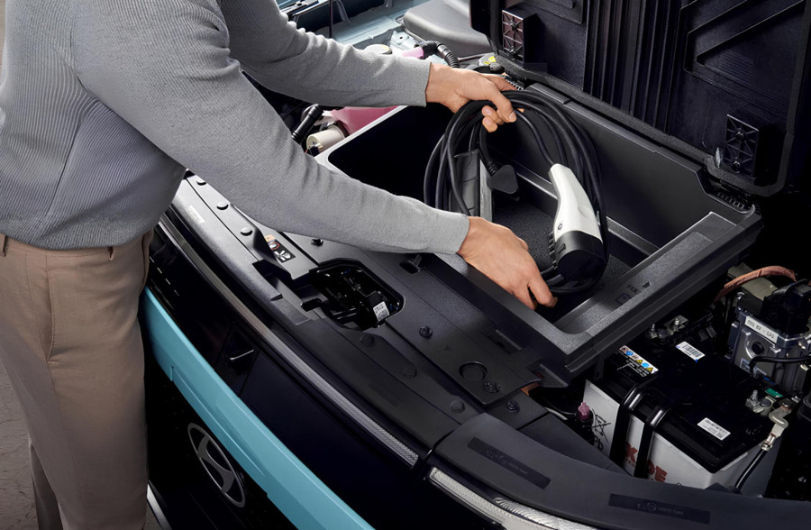 SUV ima mali prtljažni prostor napred za skladištenje kablova za punjenje i drugih sitnica. Punjač se nalazi iza Hyundai amblema na prednjem braniku.