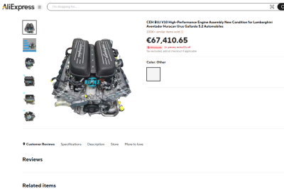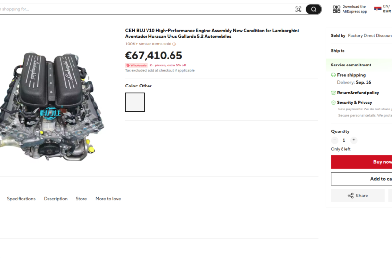 V10 motor iz Lamborghini Gallarda za mnoge ljubitelje automobila predstavlja san. Ipak, ponuđeni agregat na AliExpressu ne deluje ni pouzdano, niti je prava pogodba - V10 se nudi po visokoj ceni od oko 58.658 američkih dolara, što je preračunato približno 57.000 evra.