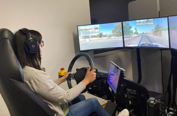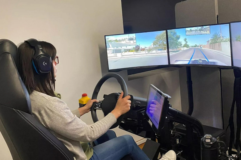 Vozači sede u posebnoj kontrolnoj sobi ispred tri velika ekrana i volana, sa "crvenim tasterom za slučaj opasnosti" koji trenutno zaustavlja automobil ako dođe do problema.