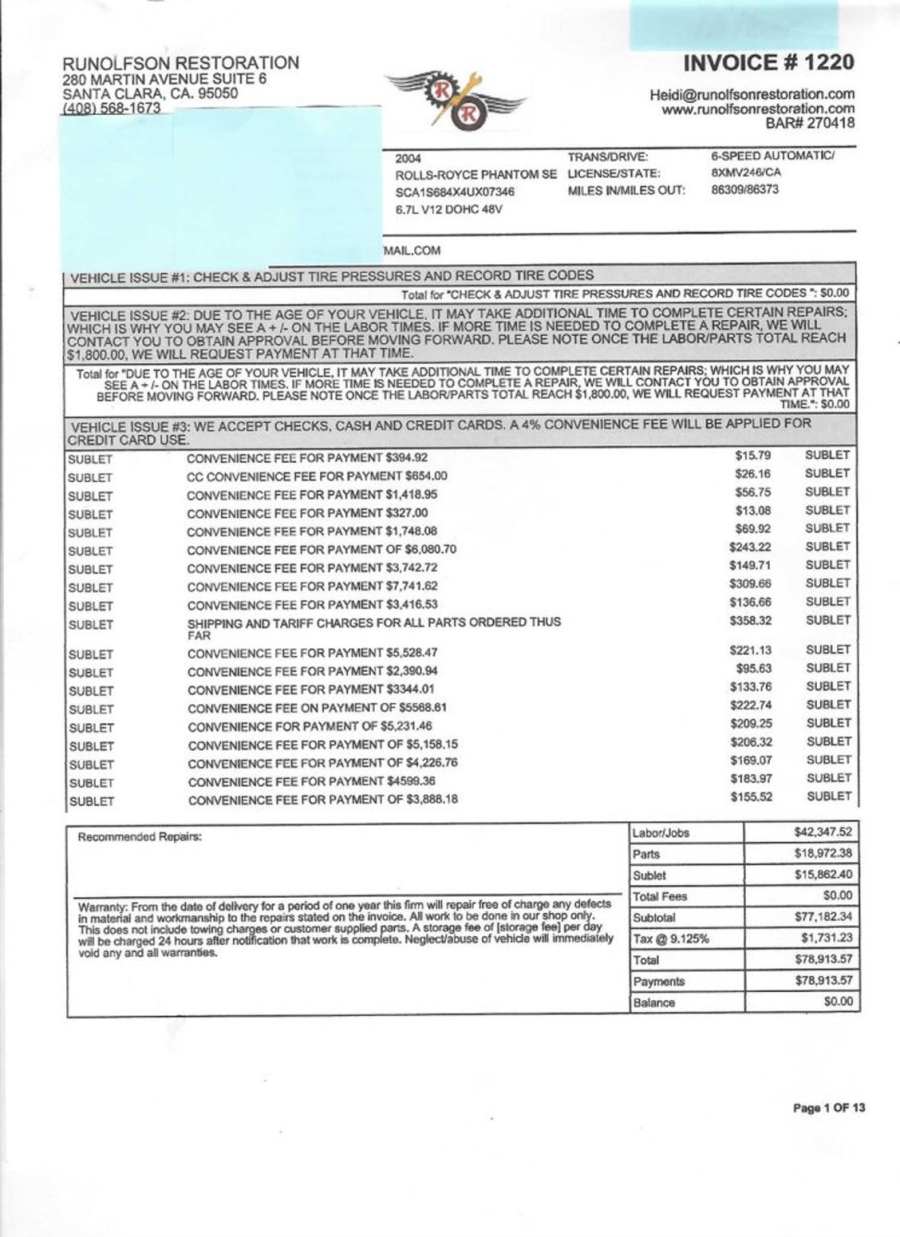 U ovom slučaju, kako pokazuje priložena faktrura, na poslednji servis automobila koji je obavljen 2022. godine potrošeno je čak 78.913,57 dolara!