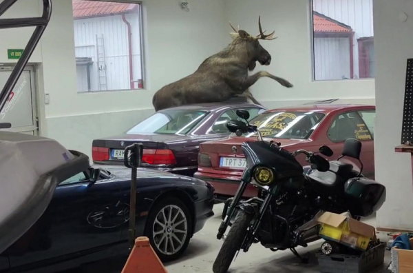 Na snimku se vidi kako se los podiže na zadnje noge i prednjim kopitima udara o haubu sveže lakiranog BMW-a 850i, koji je gotovo u potpunosti restauriran za klijenta. Ne treba posebno naglasiti da takvi udarci životinje koja može imati i 800 kilograma mogu da izazovu ozbiljnu štetu na autu.