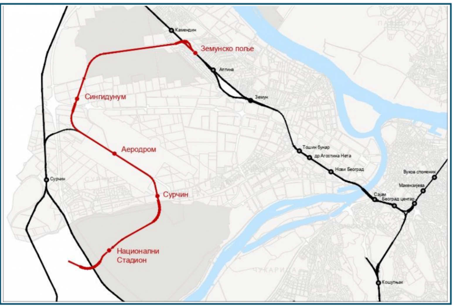Trasa pruge Zemunsko polje – Aerodrom Nikola Tesla – Nacionalni stadion će se posebnim kolosecima za svaki smer direktno povezati sa stanicom Zemunsko Polje.