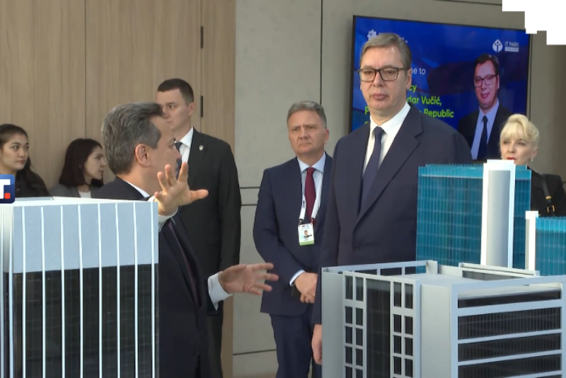 Predsednik Srbije Aleksandar Vučić posetio je danas IT park u Taškentu, a dočekao ga je Šerzod Šermatov, ministar digitalnih tehnologija Uzbekistana.