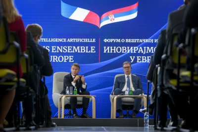 Predsednik Srbije Aleksandar Vučić i francuski predsednik Emanuel Makron obratili su se javnosti na Forumu o mladima i veštačkoj inteligenciji u kompaniji "InGrid- Schneider Electric LLC".