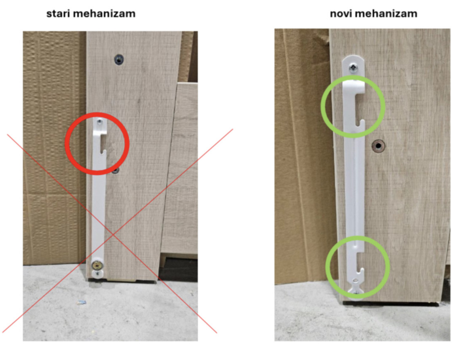Detalje o izmenama možete videti na slikama ispod. Kompanija apeluje da proverite koji mehanizam ima vaš krevetac: mehanizmi se razlikuju prema broju zubaca za zaključavanje, stari mehanizam je imamo samo jedan zubac, dok novi ima dva zupca.