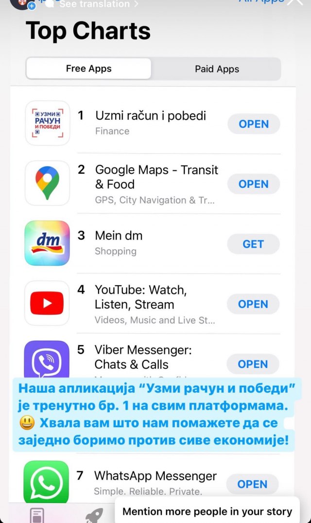 Ministarstvo finansija je objavilo da je aplikacija za nagradnu igru "Uzmi račin i pobedi" prva na listi svih platforma.