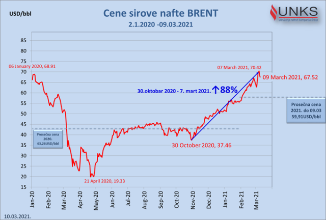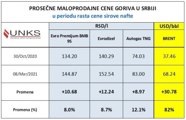 Kako za B92.net navodi generalni sekretar Udruženja naftnih kompanija Srbije Tomislav Mićović, cena sirove nafte ima trend rasta pet meseci i juče dostignuta cena BRENT-a je u odnosu na kraj oktobra povećana za 82% i to nakon pada u prethodnih dva dana, inače je skok cene BRENT-a 7. marta iznosio 88%.