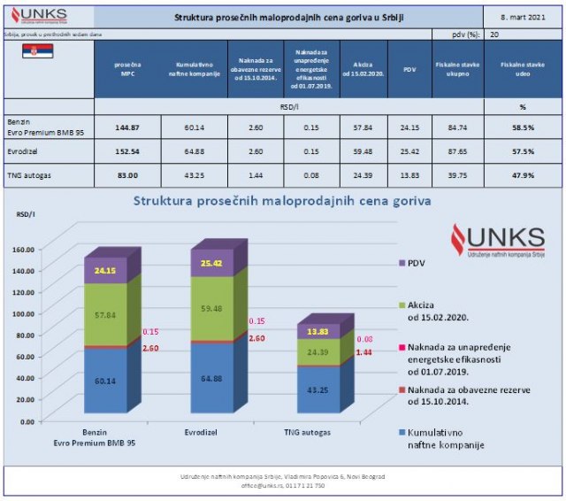 "U prosečnoj maloprodajnoj ceni, recimo, dizela koja je protekle nedelje bila 152,54 din/l, državne dažbine su iznosile 87,65 din/l ili 57,5%, a ukupno naftnim kompanijama, od izvora nafte do benzinske stanice, pripalo je 64,88 din/l", ističe Mićović.