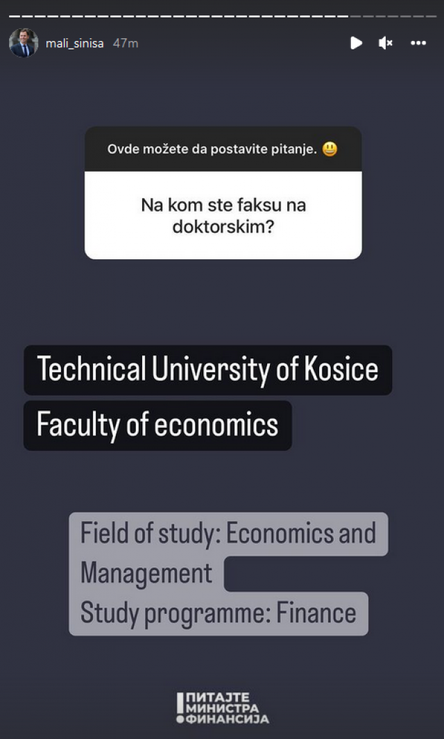 Ministar finansija Siniša Mali je, odgovarajući na pitanja građana, otkrio da je pre dve godine upisao doktorske studije na Univerzitetu u Slovačkoj.