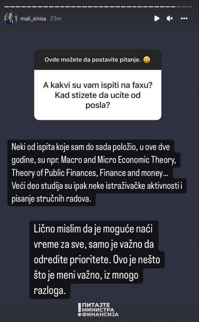 Mali je naglasio da mu je to važno iz mnogo razloga, da su u pitanju studije ekonomije, a da je studijski program "Finansije".