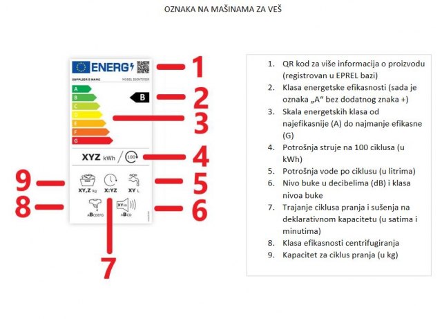 U odnosu na stare oznake, osim novih klasa energetske efikasnosti, na novoj oznaci za mašinu za veš potrošnja energije prikazana je u 100 ciklusa, označen je kapacitet za ciklus pranja, kao i potrošnja vode po ciklusima, označen je nivo buke i njegova klasa.
