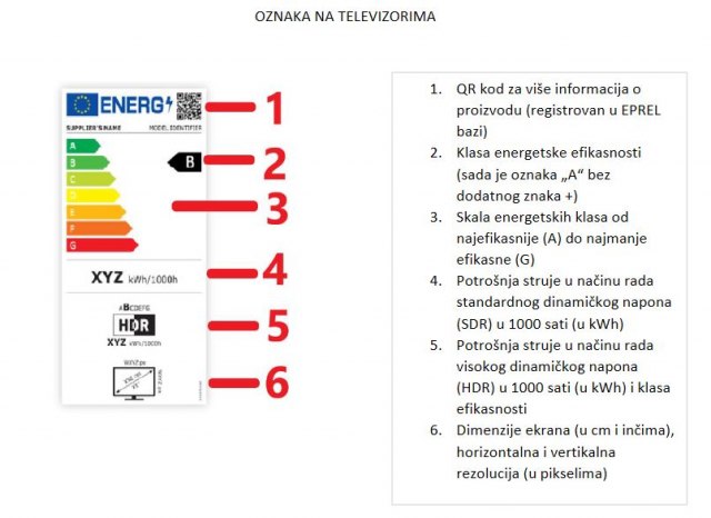 Nove oznake sadrže nove klase energetske efikasnosti, potrošnju struje u 1.000 sati rada, potrošnju struje u načinu rada velikog promenljivog opsega (HDR) u 1.000 sati, oznake horizontalne i vertikalne rezolucije, a ne sadrže oznaku snage (W).