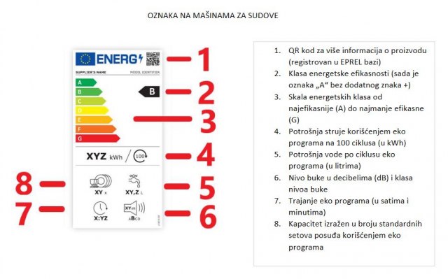 Na novim oznakama na mašinama za sudove, pored promene u klasama energetske efikasnosti, potrošnja struje označena je u eko programu na 100 ciklusa, potrošnja vode označena je po ciklusu eko programa, označeno je trajanje eko programa, nivo buke i klasa.