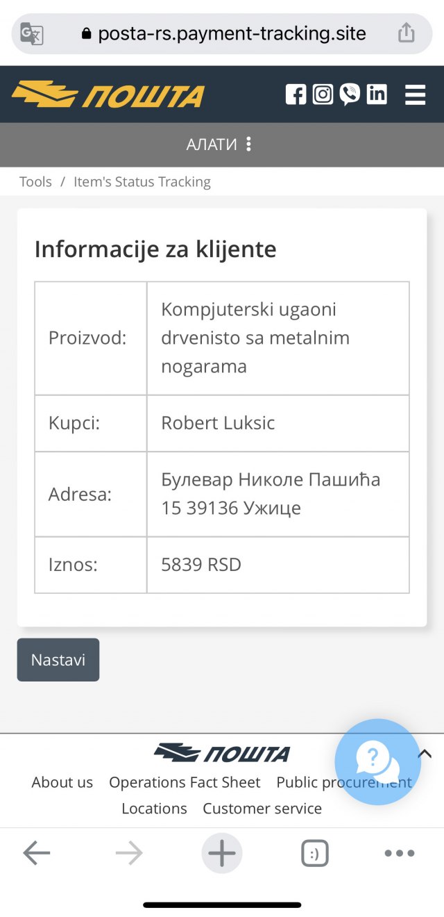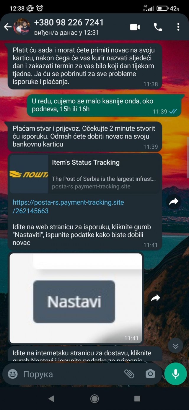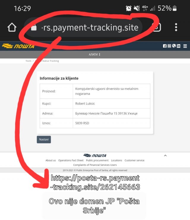 Poruke sadrže link ka stranici koja nije u vlasništvu JP "Pošta Srbije", a na kom se traži uplata novca putem platnih kartica.