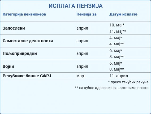 Republički fond za penzijsko i invalidsko osiguranje objavio je kalendar isplate penzija za april.