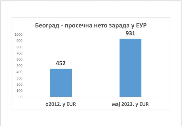 Prema njegovim rečima, u Srbiji je prosečna zarada bila 331 evro, sad je, prema podacima za mesec maj, 735 evra, dok je u Beogradu 2012. godine bila 452 evra, a danas je 931 evro.
