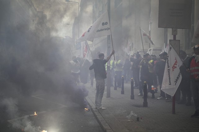 Oko 300 rudara, članova sindikata ''Solidarnost'', burno je protestovalo, koristeći dimne zavese i baklje, kako bi skrenuli pažnju na protest u centru glavnog grada, prenosi AP.