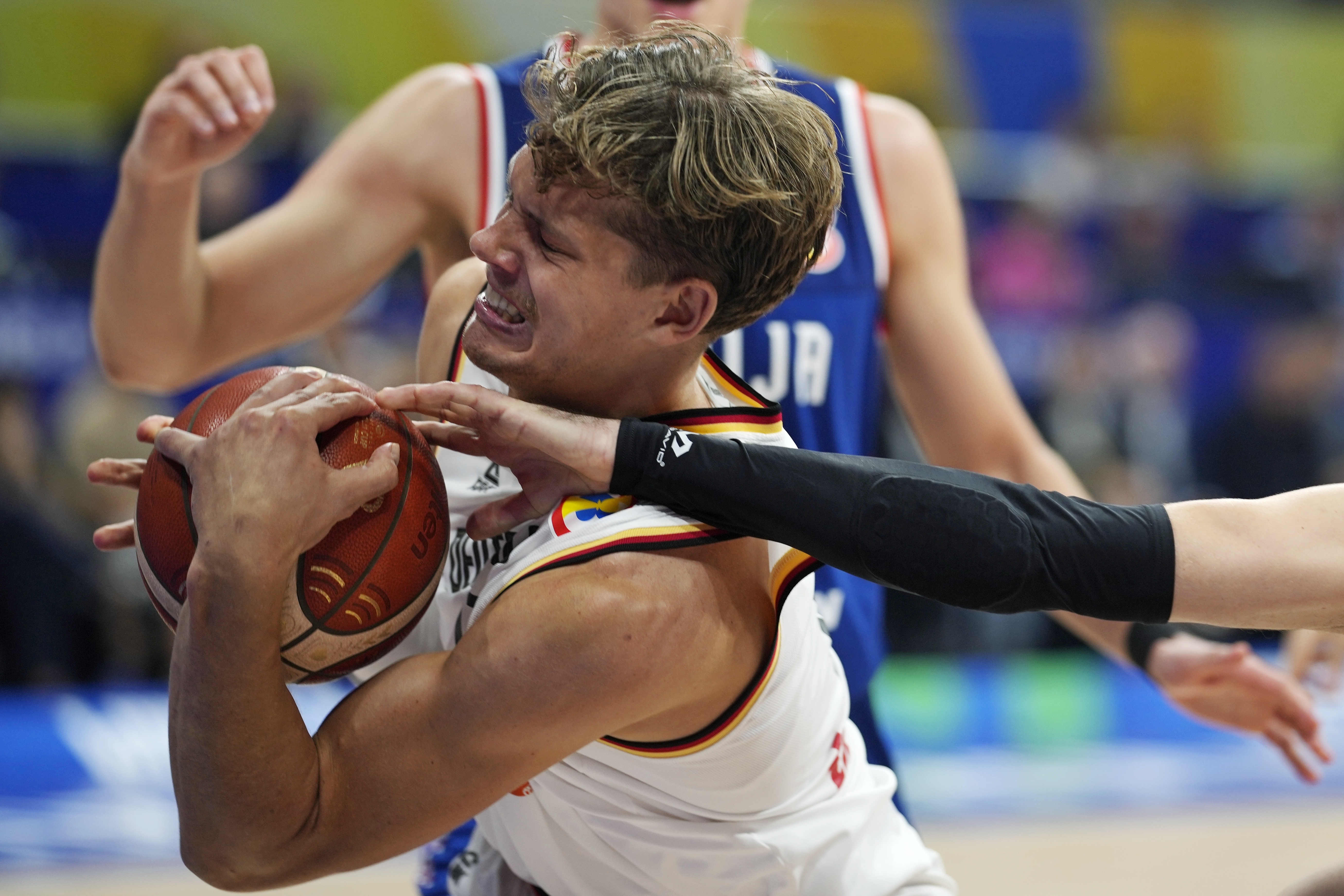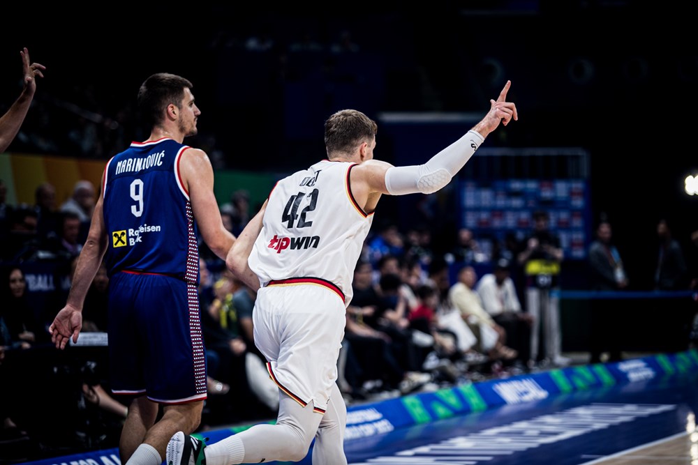 Još jedna odlična odbrana Petruševa koji izbija loptu Šruderu pa se na nju baca Jović i obezbeđuje posed, pa Gudurić prenosi loptu na protivničku polovinu. Onda je dodaje Bogdanoviću koji iz step beka pogađa trojku uz kontakt, 38:42 vodi Srbija i tajm-aut zovu Nemci