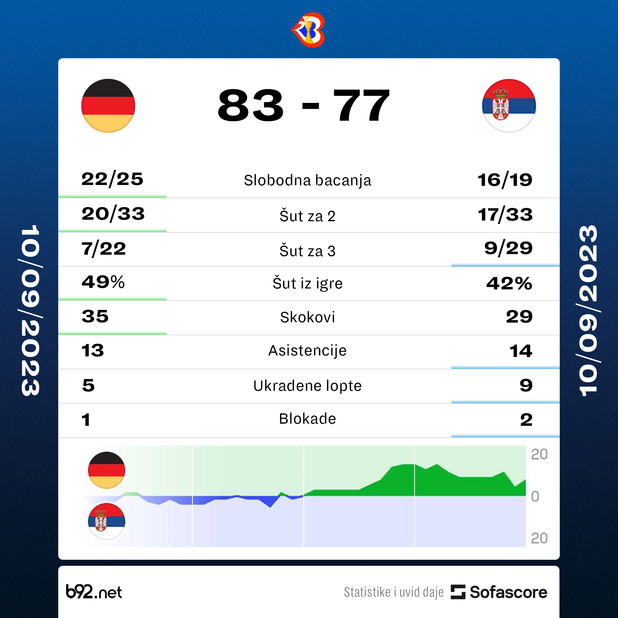 Sitno brojimo do početka utakmice, još manje od 40 minuta je ostalo do najvažnijih 40 minuta na svetu 10. septembra. Videćemo da li će Nemačka ili Srbija postati šampion sveta, novi šampion sveta.