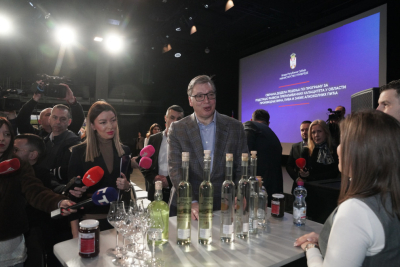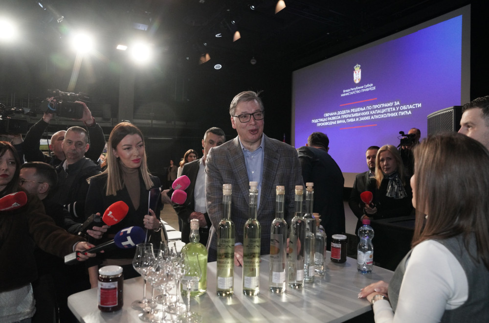 Serbian President Aleksandar Vučić is attending the ceremonial presentation of decisions at Ložionica as part of the 2025 program to support the development of processing capacities in wine, beer, and spirits production.