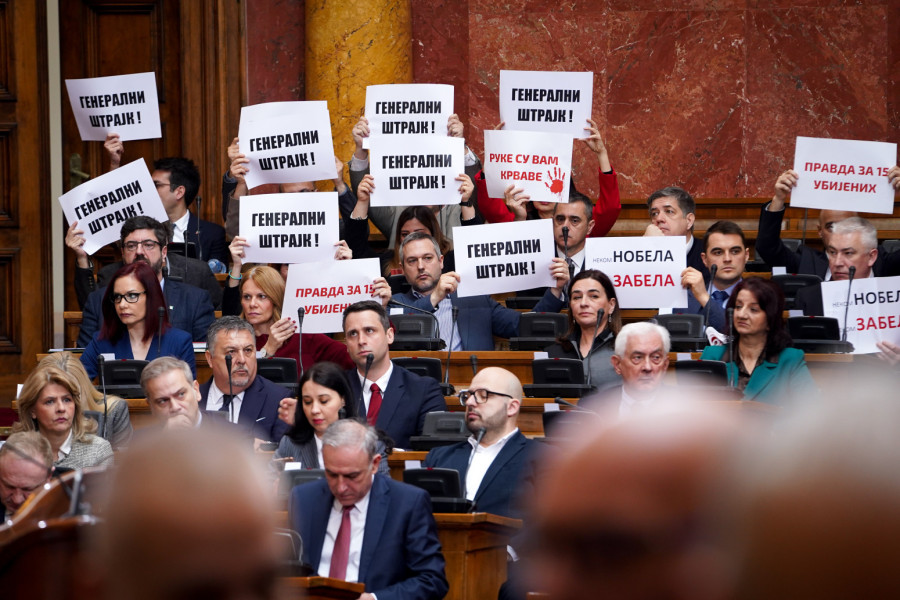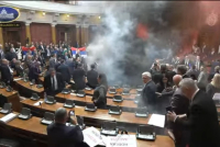 Total chaos reigned in the Serbian Parliament. Members of the opposition lit torches in the Assembly hall. Bottles fly too.
