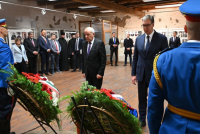 Serbian President Aleksandar Vučić and Hungarian President Tamás Sulyok today laid wreaths at the Reconciliation Monument in Čurug, as well as at the "Topal Warehouse" Raid Victims Museum.