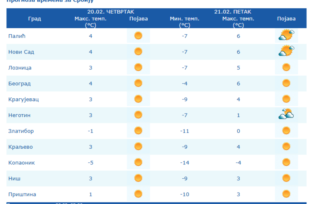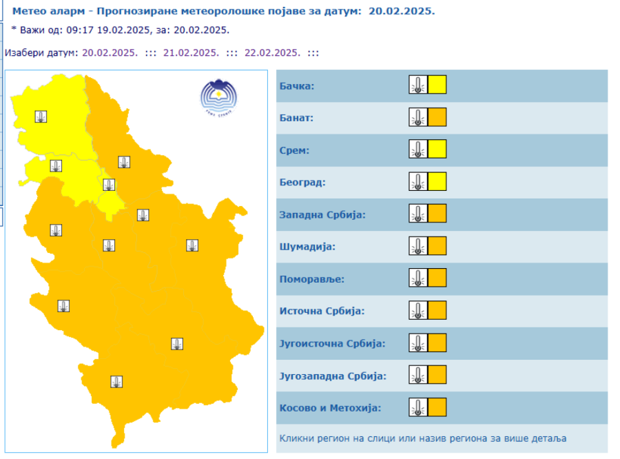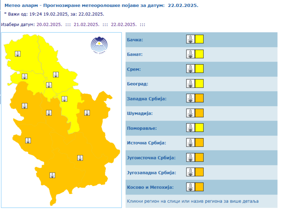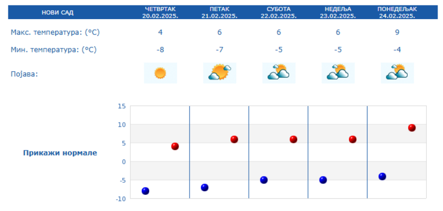 The State Hydrometeorological Institute (RHMZ) announced that on Thursday and Friday, February 20 and 21, in all regions of Serbia, and on the weekend, February 22 and 23, mainly outside the Košava area, severe frosts are expected in the morning hours.