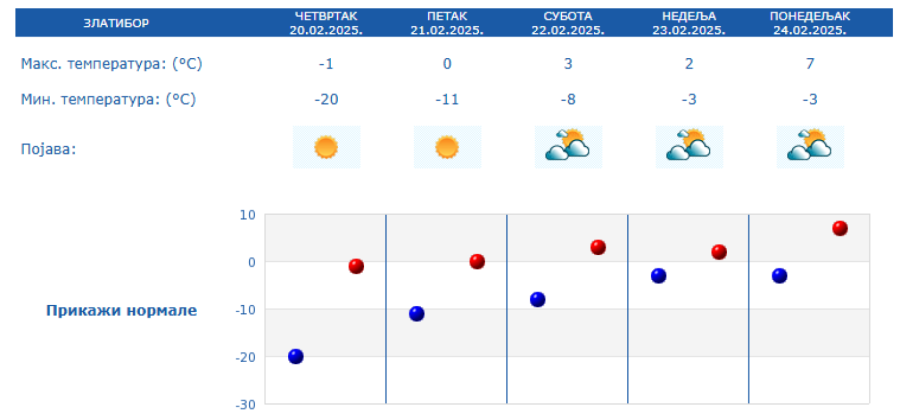 According to the data published by the RHMZ, tomorrow should be the coldest day this week, and this is supported by the fact that an incredible -20 degrees is expected on Zlatibor, followed by Kopaonik with -16.