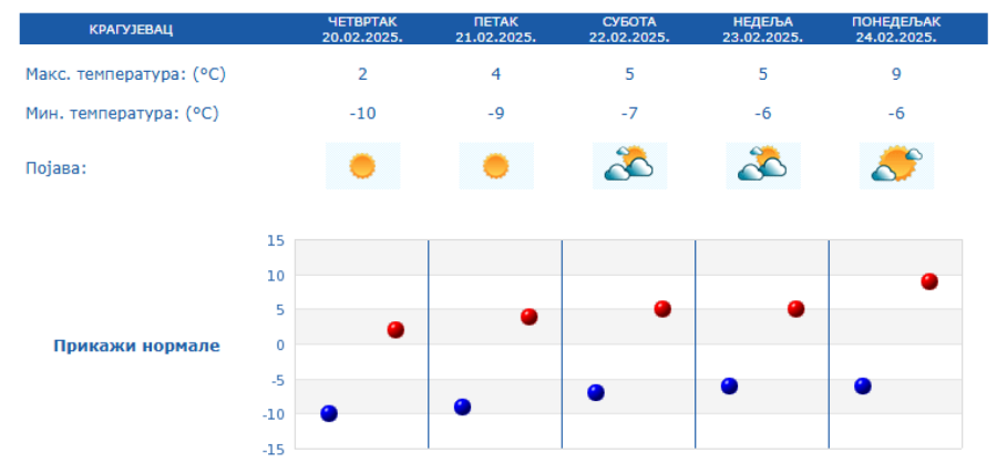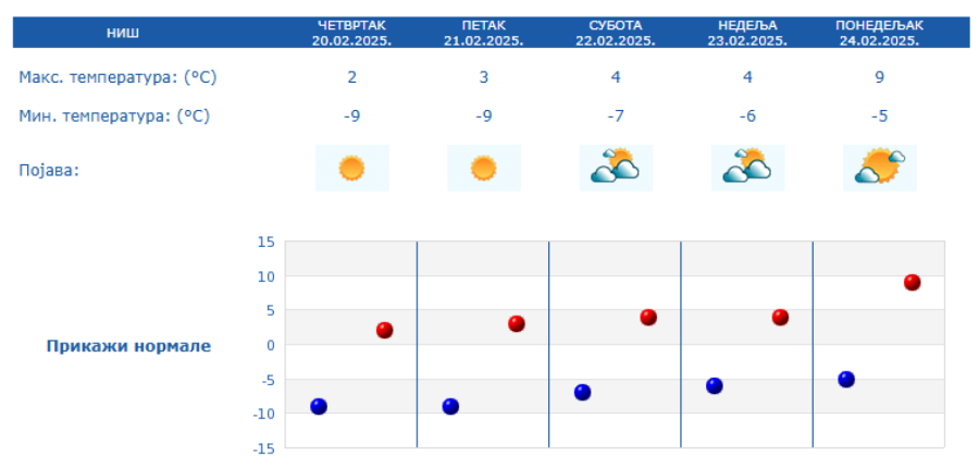 Among the cities, the coldest will be Kragujevac, Priština, Niš and Kraljevo with temperatures of -10 and -9 degrees.