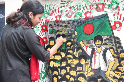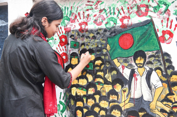 During the demonstrations, graffiti with bloody handprints appeared across Dhaka with messages directed against the regime accused of repression.