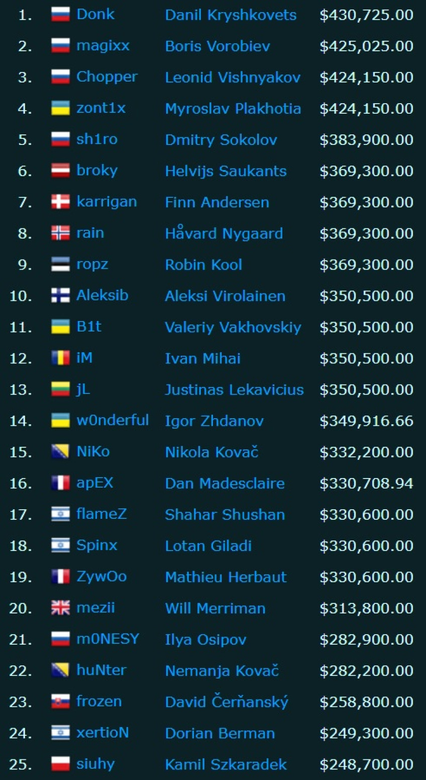 Na samom vrhu se nalazi Danil ”donk” Kriškovec, koji je sa samo 17 godina već upisan u istoriju kao najmlađi osvajač i MVP Majora. Tokom svoje trogodišnje karijere koja je počela u Spiritovom akademskom timu, zaradio je ukupno 430.725 dolara. U prvih 25 igrača nalaze se i Nikola ”NiKo” Kovač (332.200) i Nemanja ”huNter” Kovač (282.200).