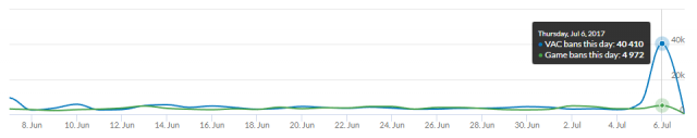 Tokom letnje Steam rasprodaje, veliki broj igara dobije znatni popust, a među njima je bio i CS:GO. Ovo je prava prilika da igrači koji imaju namere da krše pravila, pokupe svoju kopiju dosta jeftinije. Broj igrača sa sumnjivim accountima i vrlo čudnom igrom raste, pa Valve mora da reaguje. U proteklim danima sajt za praćenje statistike VAC banova je prijavio par velika talasa. Šestog jula je dodeljeno čak 40 410 VAC bana, a dani pre toga brojali su po par hiljada banovanih. Možda ste i vi sami primetili porast čitera u svojim mečmejking partijama, pogotovo sada oko letnje rasprodaje. Veliki broj hakova je detektovan, a među njima su: Aimware, Interwebz, R3Cheats, Chods-Cheats, Mutiny, x22, Iniuria, DemonInside, 5DollarCheats itd…