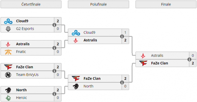 Čak od četvrtfinala FaZe nije izgubio ni jednu mapu! Prvo su u četvrtfinalu savladali Envyus, pa u polufinalu North, da bi u odlučujućem meču pobedili i Astralis. Igrali su se Cache (16:14) i Overpass (16:7), i na obema mapama evropska mix ekipa bila je bolja. Astralis je na poluvremenu vodio čak 12:3, ali na T strani nisu mogli napraviti ništa, te je usledio čaroban povratak Evropljana kome su doprineli svi igrači tima. Završnica je bila dosta napeta, ali se mašinerija nije mogla zaustaviti, pa je comeback bio upotpunjen za 1-0.