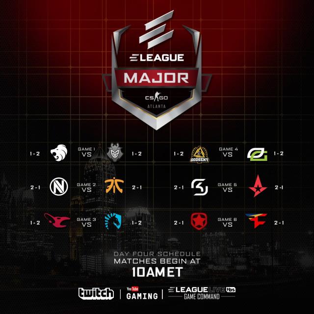 Završen je i treći dan takmičenja na CS:GO ELEAGUE Major turniru u Atlanti. Posle tri dana zanimljivih mečeva po švajcarskom sistemu na jednu dobijenu, dva tima su obezbedila mesto u daljem toku takmičenja, dok su dva tima eliminisana. Dvanaest timova će i danas igrati ovaj sistem u borbi za mesto u daljem toku takmičenja.