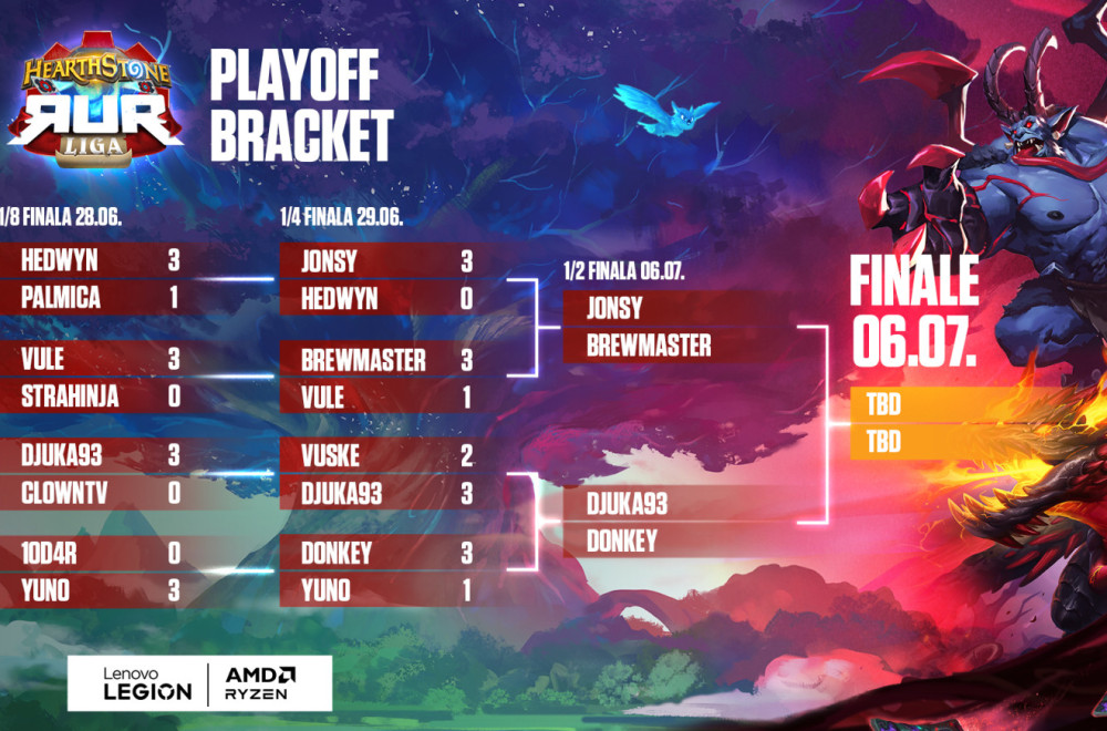 Četvrtfinalne mečeve ste mogli da ispratite u nedelju, nakon kojih smo dobili i naše polufinaliste. U nedelju 6. jula, gledaćmo Jonsy-a i Brewmastera, pre nego na red dođu Djuka93 i Donkey. Odmah zatim odigraće se i veliko finale nakon kojeg ćemo proglasiti pobednike RUR Hearthstone Lige!