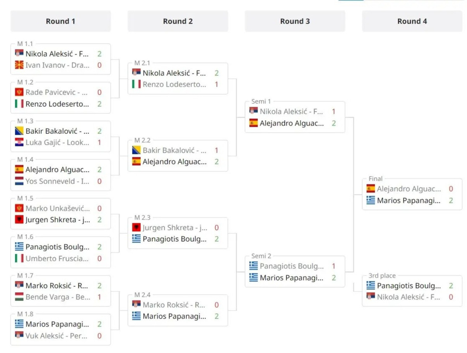 Najbolji rezultat ostvario je Nikola Aleksić sa osvojenim četvrtim mestom. U nastavku možete pogledati finalni žreb.